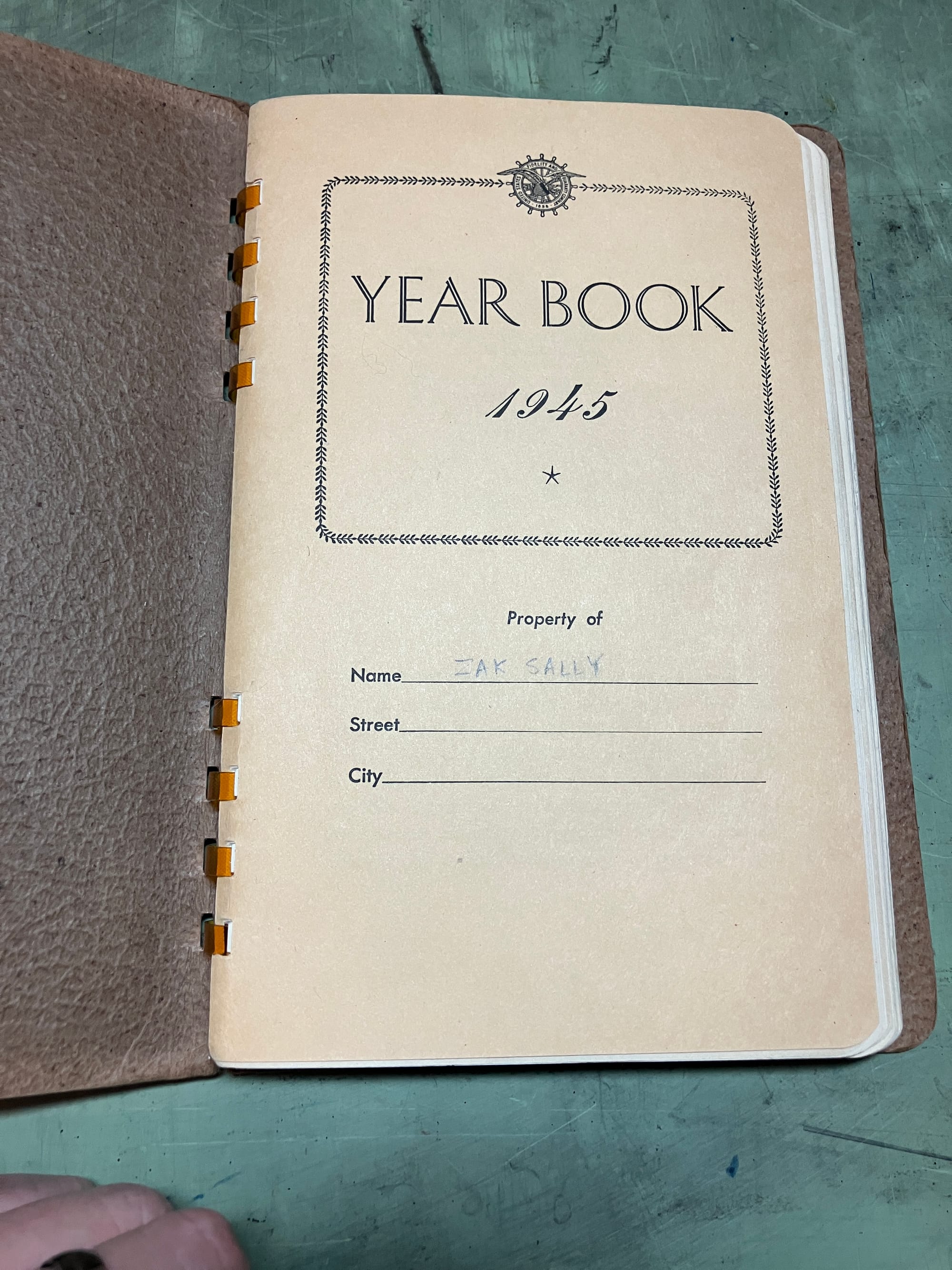 7 or 8 years ago, I found this empty bank/ insurance (?) Journal thing at a thrift store, and bought it not only because it was cool-looking, but also with the the “maybe someday I’ll use this for something” principle in mind. My house is over-filled with shit purchased on that basis, but (and this is strange, for me) at some point I googled what year the days from 1945 would hook up with a present year, and found it was 2024. Even stranger (for me), when 2024 actually rolled around, I remembered that I had this thing, and decided to actually put it to use.
