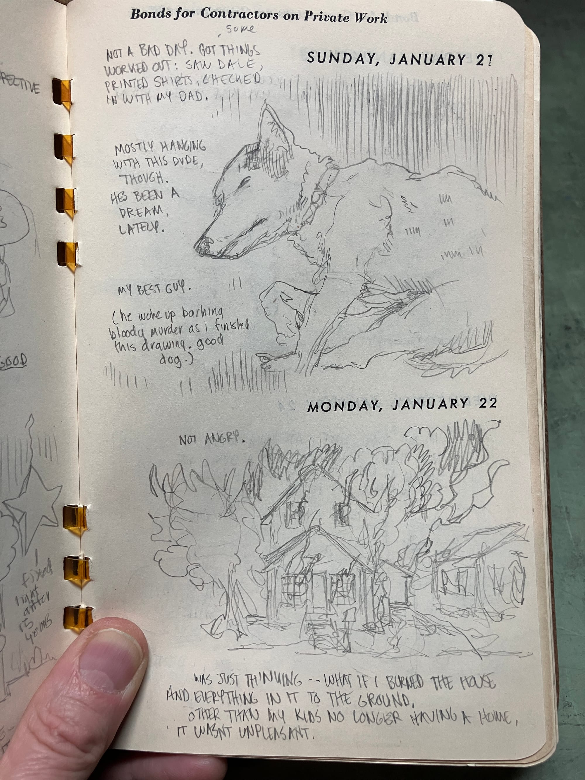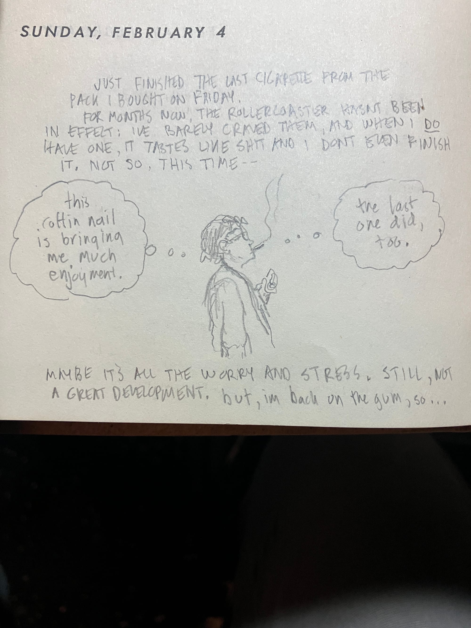 For the first few months, I was diligent in my 15-25 minute entries every night. It was nice to force myself to not worry about if it was “a good drawing”, or “meant anything”; just a quick record of time/ the day—that was, after all, the whole point. As the year wore on, my “routine” fell off; I’d find myself going back and filling in days (or weeks) that I’d missed in real time, sometimes just jotting down what I remembered of days with the intention of doing a little drawing later (sometimes that happened, sometimes…not). Now that it’s 2025, all those blank spaces…I wish I’d kept on it.