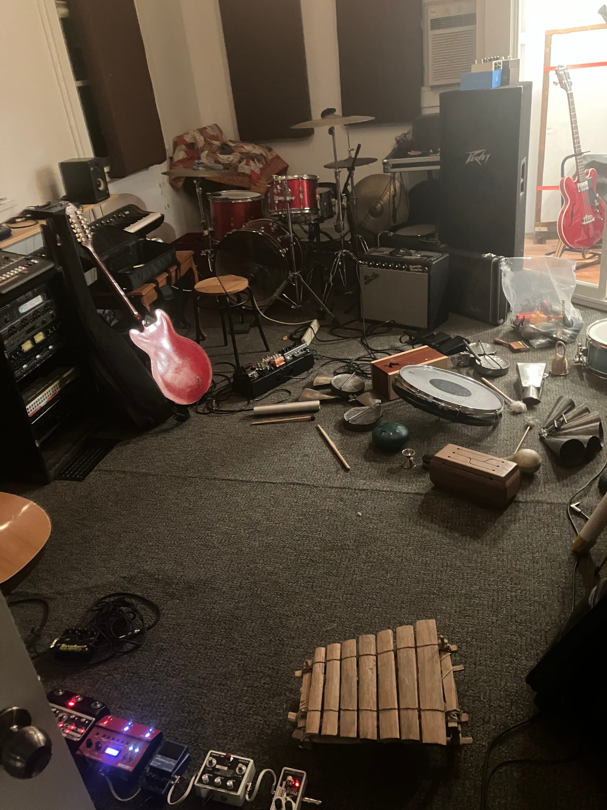Short version: we still ate tacos, but playing together was a total joy. We fell into each other's pockets almost immediately, and recorded 7-8 hours worth of stuff, over the course of 5-6 days. All improv, on the spot, just go with whatever. I think the first thing we did was just pump organ and bowed cymbals. And later, disco songs with a banjo (yeah. none of your business. Or anyone's, ever, hopefully), doom riffs, and amorphous tone things that go nowhere beautifully. But: given the above description, going through all of it (sometimes amazing, sometimes terrible/ hilarious, sometimes great for 24 seconds then terrible for 5 minutes, etc etc) and carving it into something semi-cohesive since then has been...daunting. Especially when you don't consider yourselves "a band", or really have any designs in that direction, and all parties involved have lives and work and stuff.